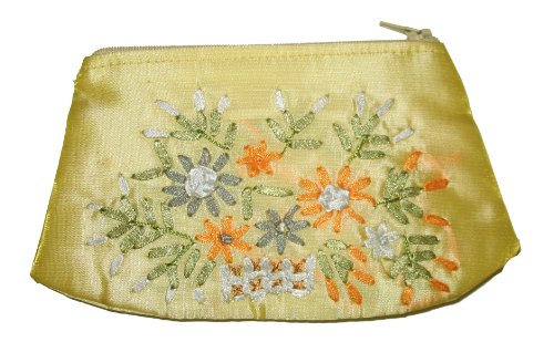 Yellow Orange Embroidered Floral Satin Makeup Bag Cosmetics Purse