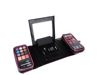 The middle of the carry case lifts up to reveal a large mirror and 7x brushes. There is a stand at the back to help prop up the mirror.