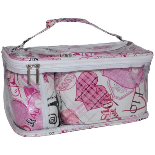 FMG Four 4 Piece Cosmetics Toiletries Bag Case Set - Pink Hearts design