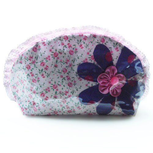 Purple flower with pink floral pattern design curvy wash bag. Covered with glossy PVC plastic for waterproof. Double zip pullers for easy openning from both sides. Ideal cosmetic or wash bag and lovely gift for any occasion. Size: L27xH14.5xW8 cm. Handmade and fair trade product