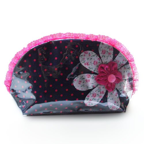 Pink flower with nevy blue polka dot design curvy wash bag. Covered with glossy PVC plastic for waterproof. Double zip pullers for easy openning from both sides. Ideal cosmetic or wash bag and lovely gift for any occasion. Size: L27xH14.5xW8 cm. Handmade and fair trade product