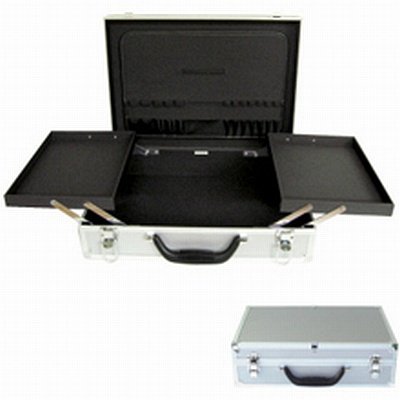 City Lights Aluminum Case. Aluminum case with two jumbo folding trays (8" x 11") and bottom storage compartment. Also features a removable elastic organizer and rubber grip cushioned handle.Dimensions: 17"L x 5"W x 12"H