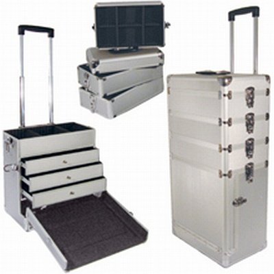 City Lights Large Detachable Aluminum Case. 14-1/2"L x 9-1/2"W x 29"H detachable aluminum case on wheels with removable telescopic pull handle. Features three (9-1/2" x 14-1/2") detachable trays with 6 removable compartments. Lower section of case has a tray with three removable compartments, 3 (13" x 17") drawers, bottom storage compartment and elastic organizer.