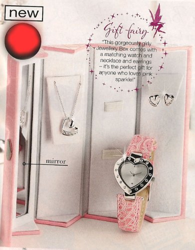 This gorgeous jewellery box comes with matching watch necklace earrings it is the perfect all in one gift for the lady that loves pink and wants to sparkle ! this is a new product for Valentine's Day by Valentine's Day Collection a wonderful Gift and comes highly recommended for that someone special all in one gift !